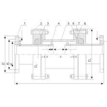 | 公稱尺寸Nominal size DN | 可撓量Deflection-length(°) | 伸縮量Compensation-length mm | L | D1 | 法蘭連接尺寸Flange connecting dimension | ||||||||