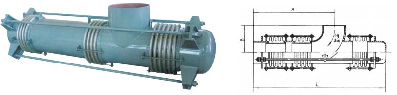 該膨脹節(jié)的兩端各有一個(gè)工作波紋管,中間有一個(gè)平衡波紋管,膨脹節(jié)通過受力構(gòu)件(大拉桿或舌管)來承受內(nèi)壓推力,因此管系只需中間固定支架。此類膨脹節(jié)只能吸收軸向位移。